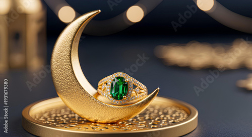 Luxury gold ring with emerald gemstone in elegant Ramadan celebration setting with crescent decoration and warm lighting. Premium jewelry concept suitable for Eid campaign, festive promotion, and luxu