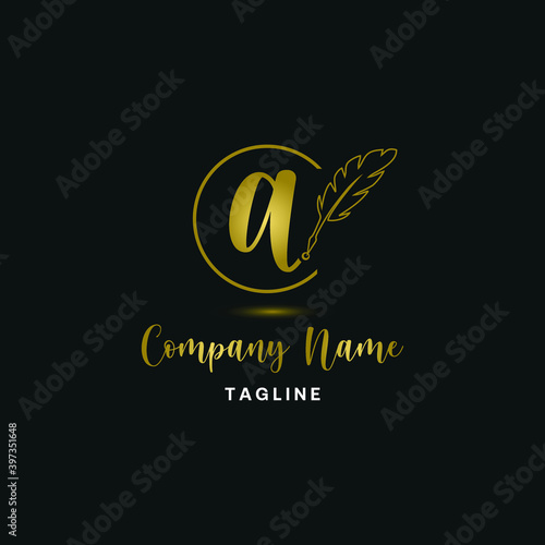 Luxury golden initial a letter with feather. Writing, art, copywrite business logo concept