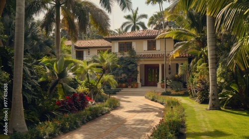 house, tropical, luxury, architecture, garden, palm, tree, green, lawn, exterior, residence, home, estate, landscaping, paradise, vacation, real, property, luxury home, villa, pathway, driveway, path, entrance, front, door, window, red, roof, brown, door, plant, leaf, sunlight, daytime, sunny, lush, bright, vibrant, beautiful