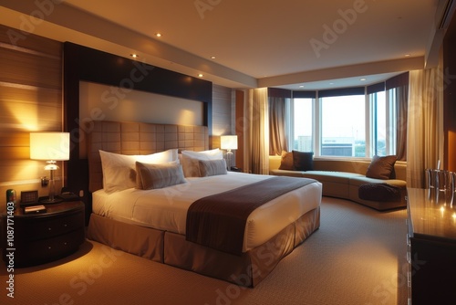 hotel room, luxury hotel, hotel, bedchamber, bed, interior design, travel, accommodation, hospitality, city view, window, lighting, decor, furniture, nightstand, lamp, carpet, pillow, comfort, interior, design, suite, elegant, vacation, relaxation, lodging, amenity, tour tourism, get-away, business trip, stylish, cosy, hotel suite