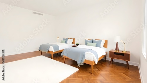 Luxury interior design of an empty hotel bedroom with a contemporary bed, table, and chairs