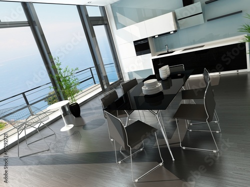 luxury, black, white, landscape, kitchen, loft, villa, dining, dining table, modern, home, furniture, interior, house, apartment, sink, contemporary, oven, nobody, domestic, new, decor, indoor, clean, design, appliance, steel, cabinet, residential, architecture, stove, showcase, room, stylish, style, stainless, wood, floor, living, lifestyle, estate, window, refrigerator, residence, furnishing