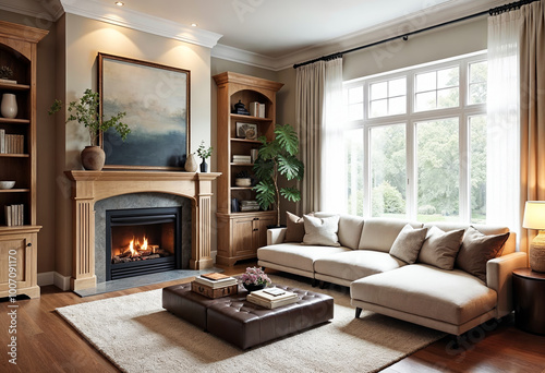 Luxury living room interior with fireplace sofa bookshelves and window view comfortable home decor hardwood floor natural light homey atmosphere real estate interior design house beautiful elegant