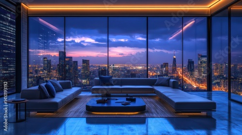 modern, penthouse, living, room, city, view, interior, design, luxury, architecture, contemporary, urban, apartment, real, estate, home, elegant, space, sophisticated, seating, furniture, window, floor, dark, blue, colours, soft, light, sunset, sunrise, photorealistic, rendering, three-dimensional, visualisation, high, resolution, image, commercial, property