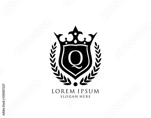 Luxury Monogram Q Letter Logo. Vintage King Crown badge design for Royalty, Letter Stamp, Boutique, Hotel, Heraldic, Jewelry, Wedding.