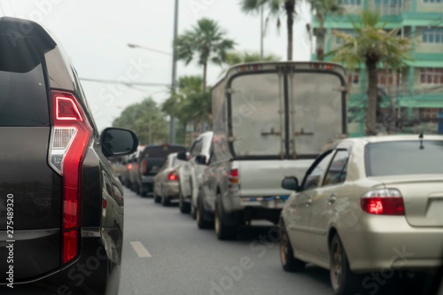 Luxury of brown car stop on the asphalt road in rush hours. Traveling in the provinces during the bright period. Open light brake. With tree and city.