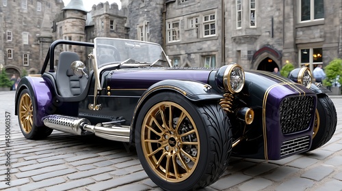 Luxury Purple and Gold Sports Car Parked on Cobblestone Street near Historic Building