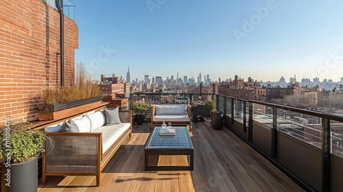 rooftop, terrace, city, skyline, view, apartment, building, urban, landscape, furniture, sofa, table, plant, decor, design, modern, luxury, architecture, home, living, space, relaxation, comfort, style, elegant, chic, sophisticated, sun, day, bright, warm, wooden, deck, balcony, metropolis, skyscraper, horizon