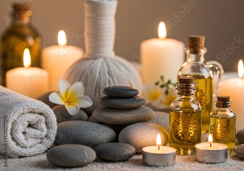 Luxury spa scene with aromatic candles, smooth stones, and herbal oils