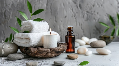 Luxury spa setting with white towels, rocks and candle on a wooden stand, essential oil bottle, green leaves in a bowl, gray background for copy space