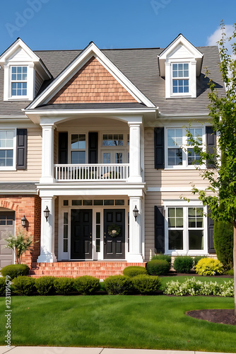 house, home, exterior, architecture, building, residential, property, facades, design, luxury, modern, suburban, brick, window, door, roof, landscaping, lawn, balcony, column, garden, american