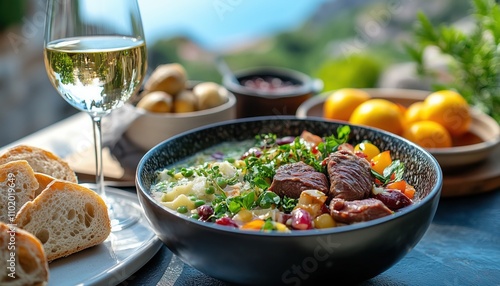 Luxury summer lunch with gourmet dishes on a beautiful outdoor terrace