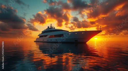 Luxury superyacht with a sunset background, beautiful clouds, and a sea view.