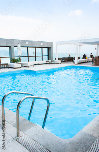blue, sky, tour tourism, travel, water, beautiful, bright, chair, holiday, home, hotel, house, leisure, luxury, modern, nobody, paradise, pool, poolside, relax, relaxation, resort, shiny, spa, summer, sun, sunlight, sunny, swimming, turquoise, vacation, view, villa