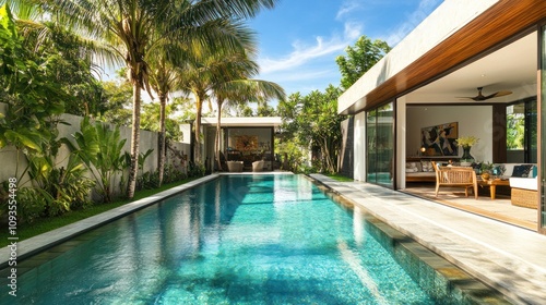 pool, villa, tropical, modern, luxury, architecture, design, house, home, residence, building, property, estate, vacation, holiday, paradise, relaxation, resort, swimming, water, palm, tree, greenery, landscaping, garden, plant, sun, sky, blue, day, summer, bright, clean, contemporary, minimalist, stylish, elegant, peaceful, serene, tranquil