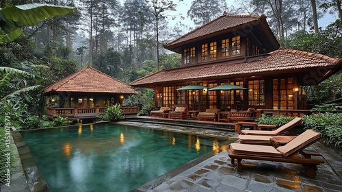 villa, luxury, tropical, resort, architecture, pool, landscape, travel, vacation, real estate, home, house, building, design, hotel, get-away, calmness, serenity, peaceful, relaxation, comfort, opulence, paradise, natural, wood, terracotta, green, warm, lighting, composition, marketing, advertising, business, commercial, photo, image, high-end, upscale, residential, estate, spa, zen