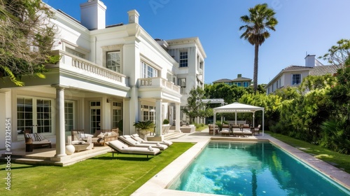 house, pool, luxury, villa, garden, residence, luxury home, exterior, backyard, home, architecture, estate, swimming, patio, lawn, grass, water, relaxation, resort, tropical, white, modern, design, elegant, lifestyle, beautiful, dream, real, property, residential, green, landscape, palm, tree, deck, chair, furniture, table, sunny, day, blue, sky, summer, bright, fresh, clean, classic, daytime