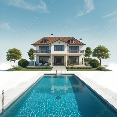 luxury home, pool, swimming pool, house, villa, real estate, architecture, modern architecture, landscaping, garden, tree, white house, red roof, property, poolside, relaxation, vacation home, backyard, luxury home