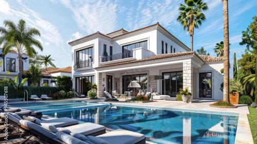 villa, swimming, pool, luxury, residence, house, palm, tree, tropical, modern, architecture, exterior, backyard, poolside, lounge, chair, patio, water, blue, sky, green, garden, landscaping, stone, white, brown, sunny, daytime, resort, home, estate, relaxation, vacation, lifestyle, design, real, dream, private