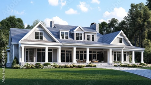 house, home, architecture, design, rendering, luxury, estate, property, residential, building, luxury home, villa, modern, contemporary, classic, elegant, grand, roomy, comfortable, homeowner, family, lifestyle, exterior, facades, porch, column, window, roof, landscaping, lawn, garden, tree, sky, cloud, daylight, summer, grey, white
