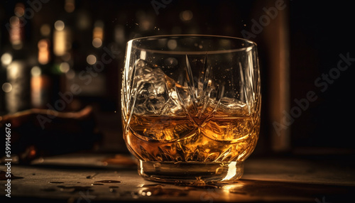 Luxury whiskey glass reflects golden party celebration generated by AI
