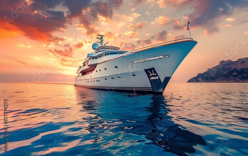 Luxury yacht at sunset on the open sea. Summer travel and vacation concept. Traveling and yachting. Nautical travel and adventure concept.