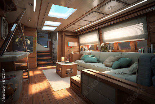 yacht, interior, living room, design, furniture, sofa, wooden, luxury, modern, roomy, natural light, comfortable, elegant, nautical, decor, home, boat, sea, ocean, travel, vacation, relaxation, style, decorating, architecture, room, space, water, view, sunlight, cosy, stylish, contemporary