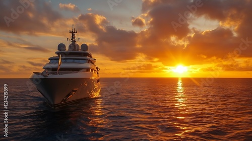 Luxury Yacht Sailing During Golden Sunset on Tranquil Open Sea Horizon : Generative AI