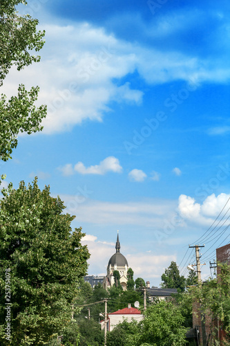 church, lviv, ukraine, city landscape, ukrainian, greek, catholic, neo, roman, gothic, lord, ascension, city, town, nature, blue, sky, cloud, cloudscape, cathedral, old, landscape, religion, religious, christian, building, christianity, architecture, day, europa, stone, heritage, light, sunlight, sun, roof, summer, foliage, frame, temple, dome, culture, 1900, style, view, background