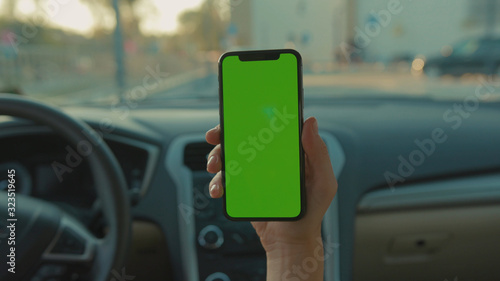 Lviv, Ukraine - May 19, 2018: Female driver sitting in the car browsing online map on vertical mock-up smartphone greenscreen searching route planning a roadtrip. Lifestyle and technology.
