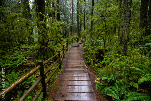 Lynn Canyon Park, North Vancouver, British Columbia, Canada. Beautiful Wooden Path in the Rainforest during a wet and rainy day.