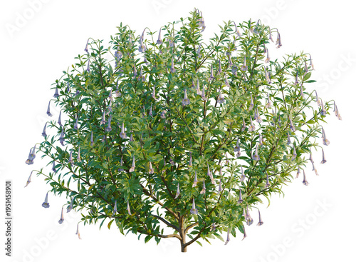 Lysionotus pauciflorus tree, elevation, front view, cutout, transparent background, isolate, Delicate purple flowers bloom on a lush green plant, detailed botanical illustration.