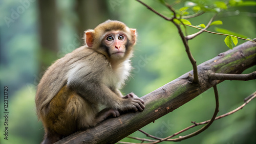 Macaque Sitting on a Tree.