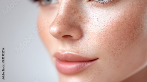 Macro close up of glowing healthy skin with perfect pore texture and natural freckles on cheek and nose, showing smooth lips and soft facial features in soft lighting
