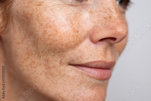 macro close-up of middle-age skin with freckles and mild pigmentation