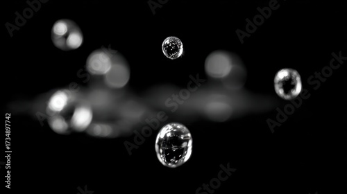 macro, droplet, water, splash, high speed, greyscale, liquid, abstract, transparent, bubble, motion, kinetic, dynamic, blurred, black, white, contrast, texture, surface, droplet, light, shadow, form, nature, purity, clear, cold, fresh, clean, detail, sharpened, gravity, levitation, air, vapour, condensation, smooth, ball-shaped, floating, movement, energy, calm, pristine, photographic, art, composition, modern, minimalism
