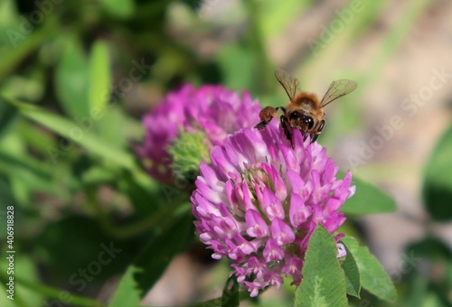 honey bee, trefoil, flower, front view, green, grass, meadow, summer, detail, blurred background, soft focus, bee, selective focus, copy space, insect, blossom, bloom, purple, pink, macro, closeup, pollinate, bokeh, feeding, wallpaper, clover
