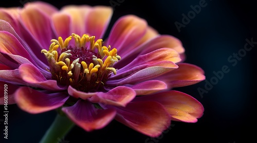 zinnia, flower, macro, closeup, floral, nature, botany, bloom, blossom, vibrant, colours, detail, yellow, purple, pink, orange, high contrast, dark background, stamen, pistil, flora, garden, seasonal, fresh, growth, beauty, delicate, artistic, elegant, isolated, single, plant, natural, still life, decorative, organic, pattern, texture, intricate