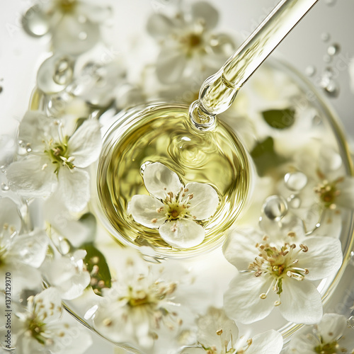 Macro of floral essence dropper with cherry blossom floating in golden oil, luxury skincare concept