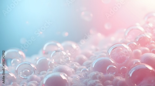 Macro photo of bubbles in water. Pink and blue background with foam made of soap, shampoo, lotion, detergent. Banner with copy space for laundry and cleaning services, beauty, skin care, spa, concept