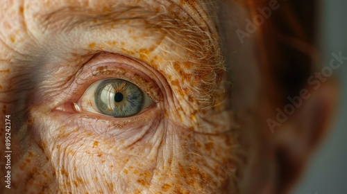 freckle, green eye, closeup, ageing, detail, portrait, elderly, face, mature woman, natural light, human eye, texture, old age, seniority, realistic, hi-res, grey background, wisdom, head shot, expressive