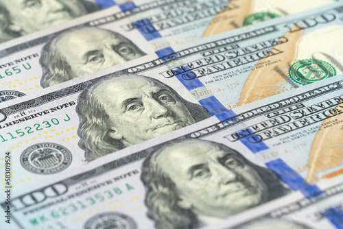 Macro photography of 100 dollar bills in a row. International currency. Background of dollar bills.