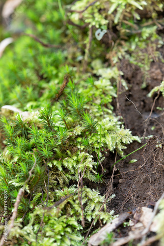 Macro photography of fresh green moss: Detailed texture of woodland bryophytes on moist forest soil