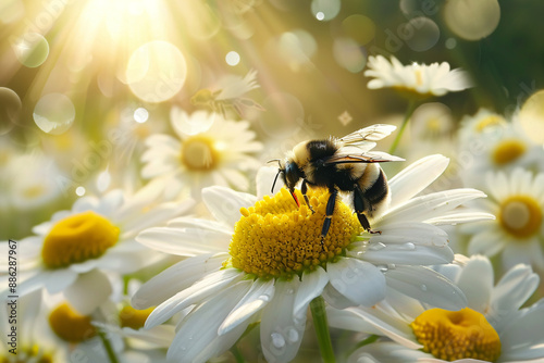Macro photography of working honeybee pollinating flowers and collecting honey nectar on meadow. Concept of organic eco-products, extraction, agriculture and healthy with copy space.