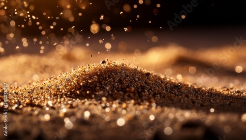 Macro sand grains scattered on dark surface: soft light illuminates individual grains, highlighting texture. Minimalist, earthy texture. Ideal for backgrounds and subtle design elements
