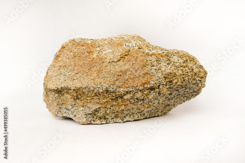 Macro shooting of raw specimen biotite granite gneiss rock isolated on white background.