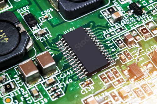 Macro shot of a Circuitboard with resistors microchips and electronic components. Computer hardware technology. Integrated communication processor. Information engineering. Semiconductor. PCB. Closeup