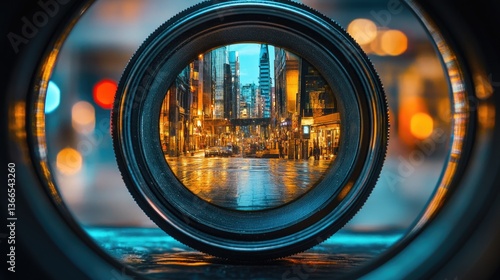 Macro shot of a film camera lens with reflections of an old cityscape in the glass.