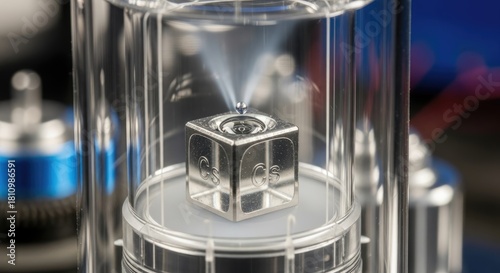 Macro shot of a metal cube within a transparent cylindrical device, emitting a focused stream of particles or vapor. Complex machinery, close-up details. Blue and grey tones