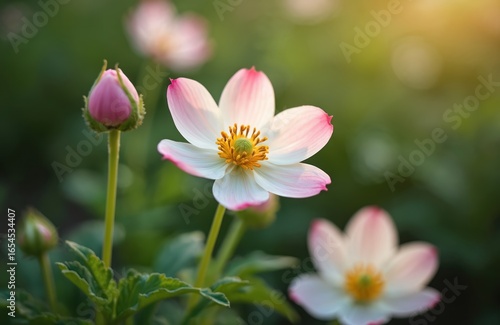 Macro shot of delicate pink, white Chinese anemone flowers blooming in garden. Captures natural beauty of Anemone hupehensis with detailed petals, yellow stamens against soft green bokeh background.